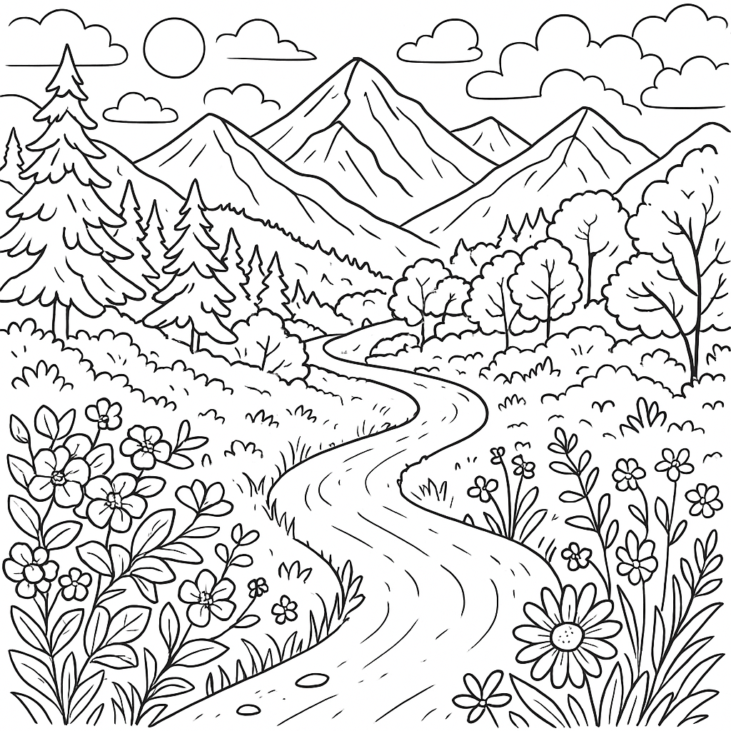 A detailed coloring page featuring a hiking trail winding through spring mountains. Perfect for tweens (9-12) with intricate detail for a fun coloring experience.