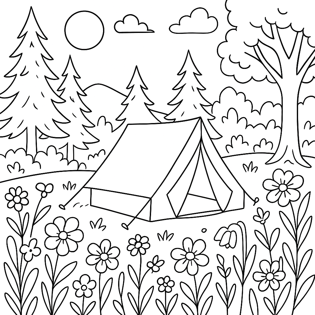 A medium coloring page featuring camping scene in forest with spring wildflowers. Perfect for kids (6-9) with moderately detailed outlines for a fun coloring experience.