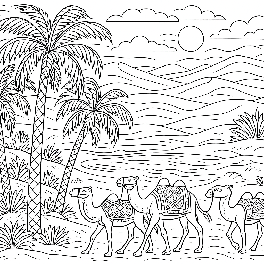 A detailed coloring page featuring desert oasis with palm trees and camel caravan. Perfect for tweens (9-12) with intricate detail for a fun coloring experience.