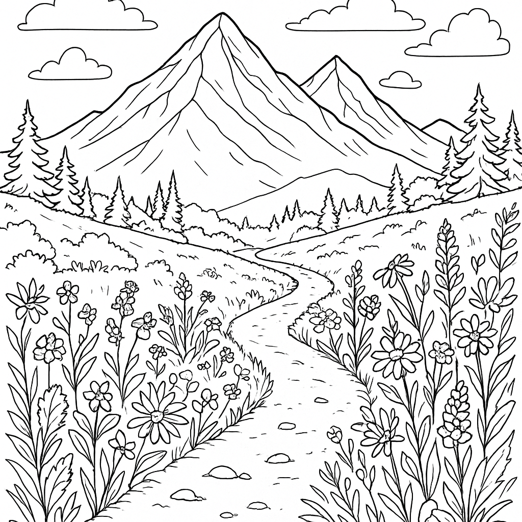 A detailed coloring page featuring mountain hiking trail with spring wildflowers. Perfect for kids (6-9) with intricate detail for a fun coloring experience.