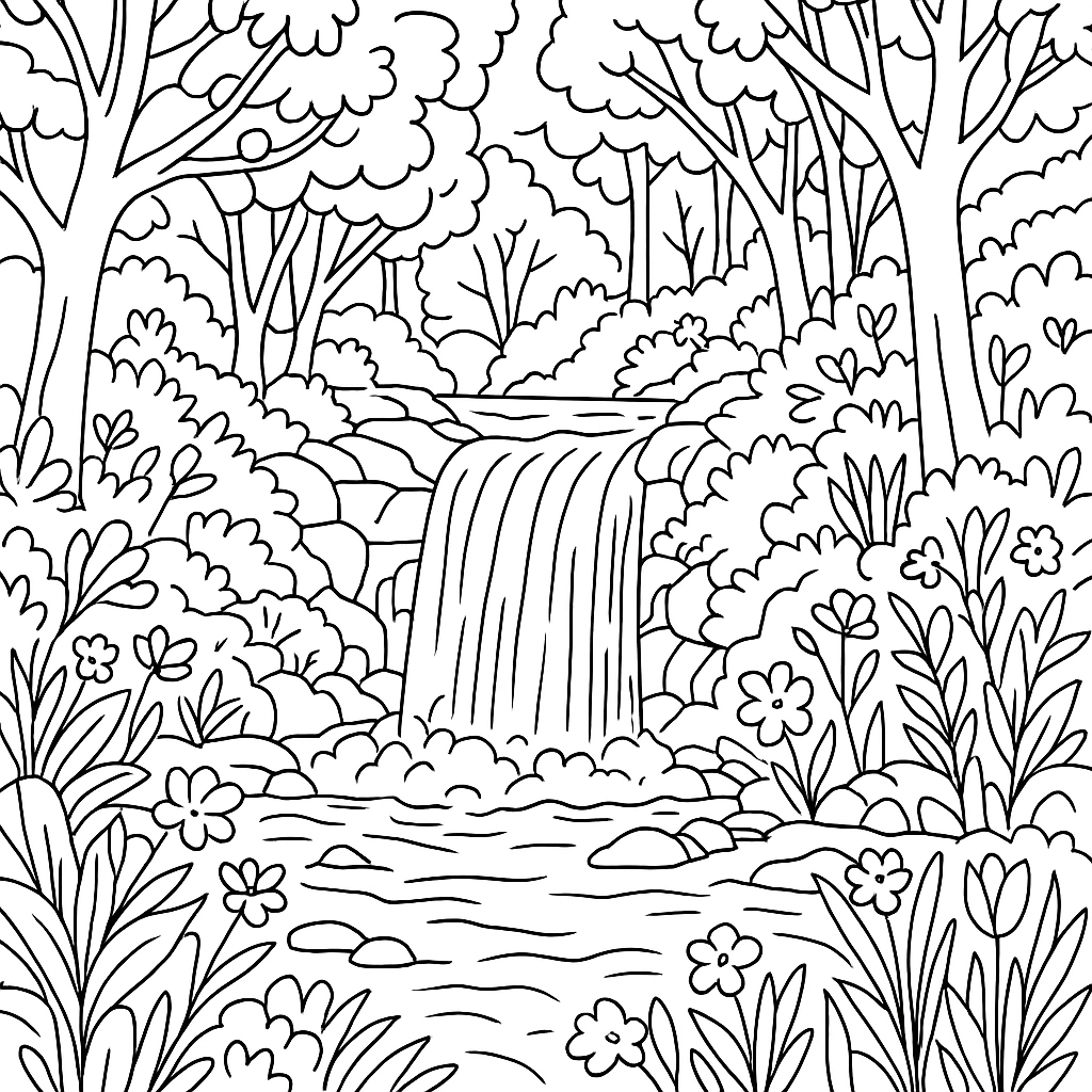 A detailed coloring page featuring waterfall cascading through spring forest scene. Perfect for tweens (9-12) with intricate detail for a fun coloring experience.
