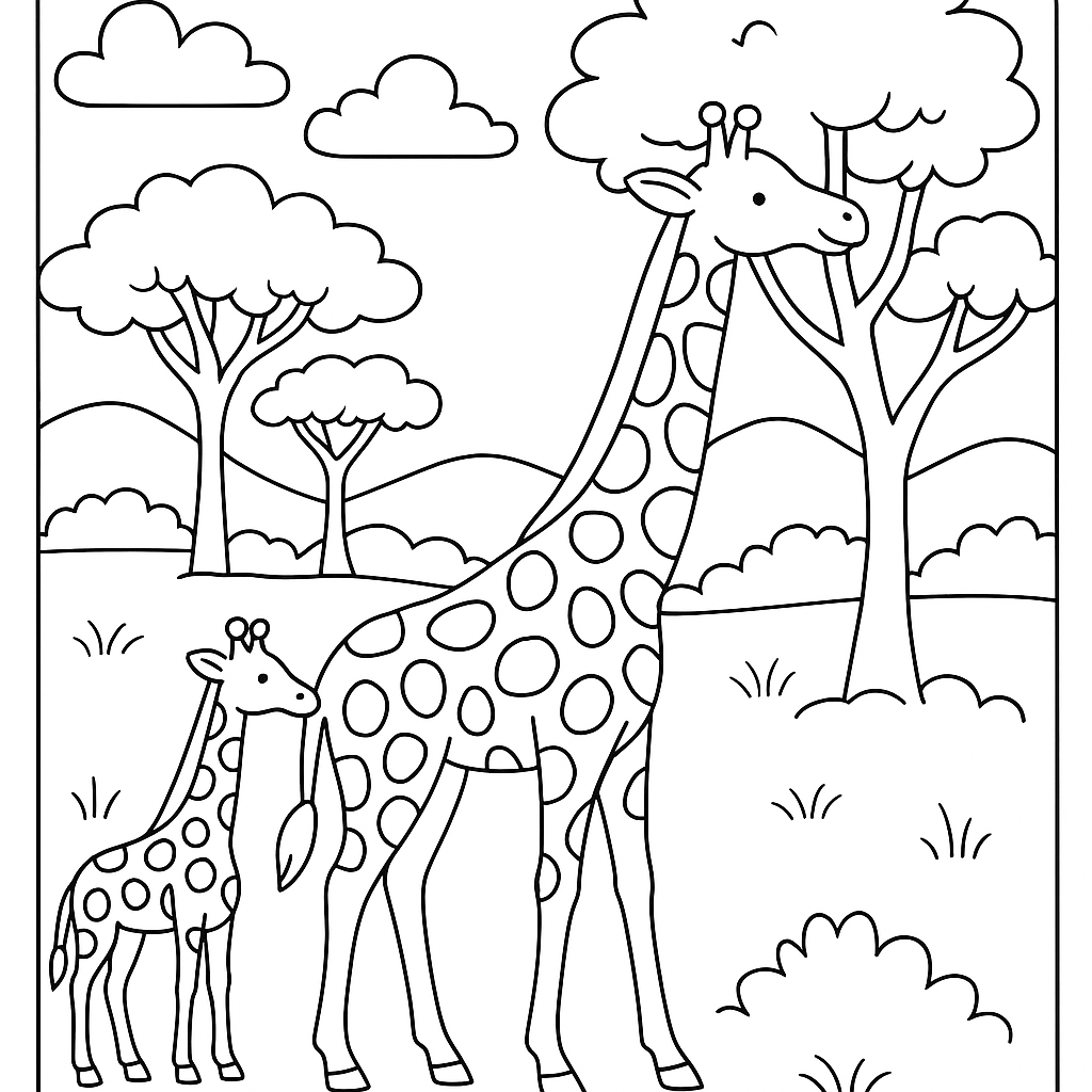 A medium coloring page featuring African safari scene with acacia trees and giraffes. Perfect for kids (6-9) with moderately detailed outlines for a fun coloring experience.