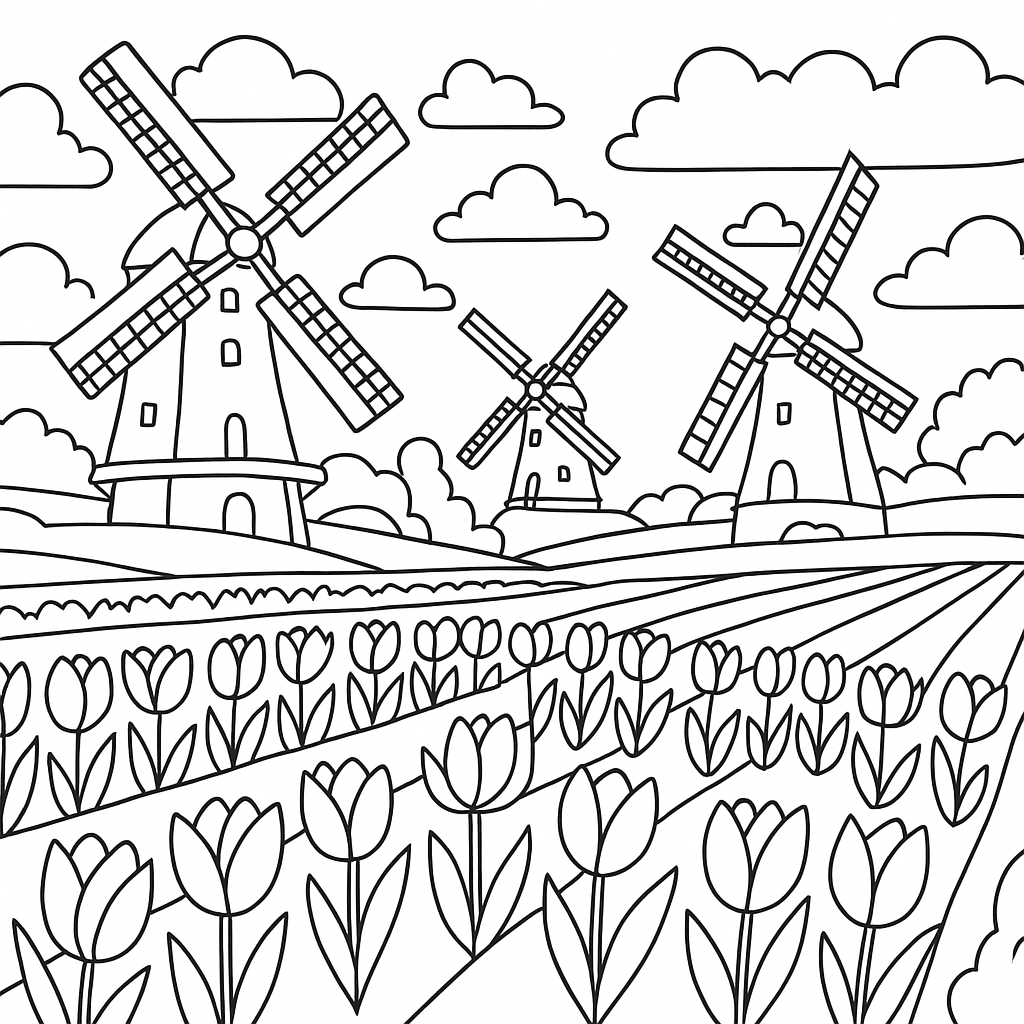 A medium coloring page featuring Dutch countryside with windmills and tulip fields. Perfect for kids (6-9) with moderately detailed outlines for a fun coloring experience.