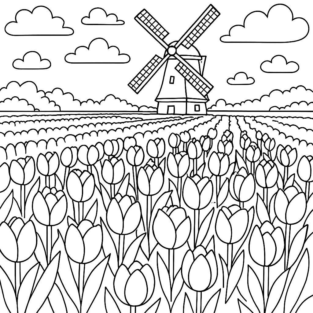 A medium coloring page featuring dutch tulip fields in full spring bloom. Perfect for kids (6-9) with moderately detailed outlines for a fun coloring experience.