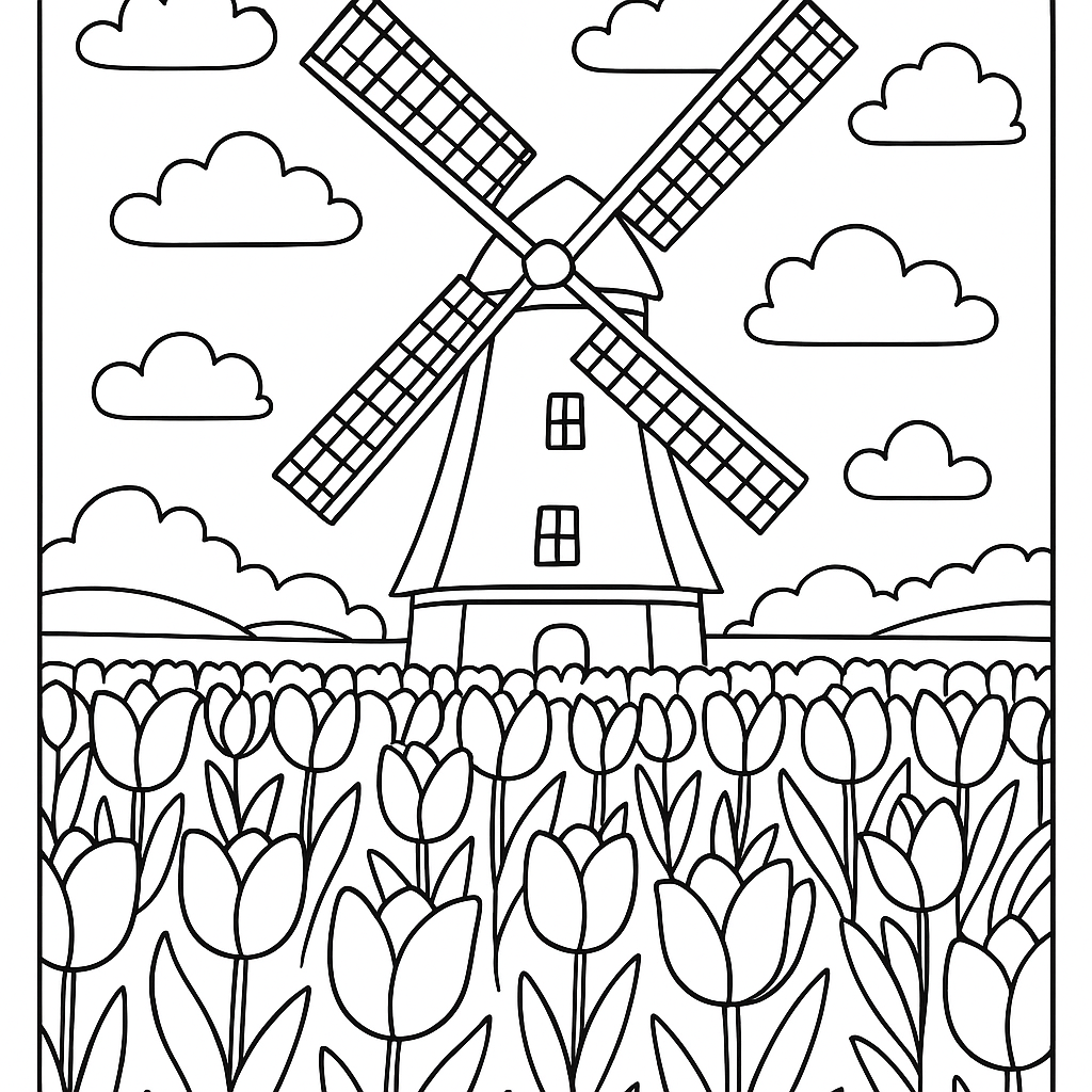 A medium coloring page featuring Dutch windmill surrounded by blooming tulip fields. Perfect for kids (6-9) with moderately detailed outlines for a fun coloring experience.