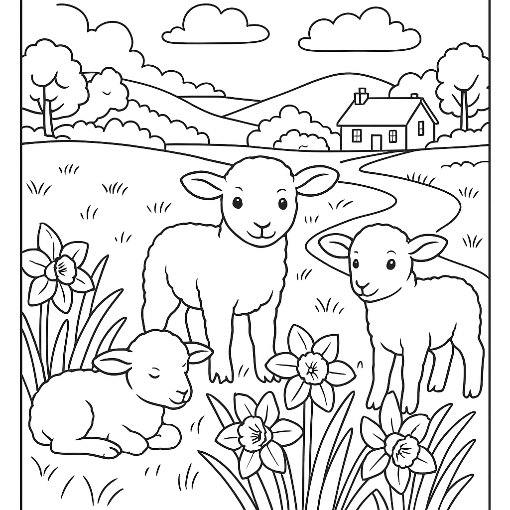 A medium coloring page featuring English countryside with lambs and daffodils. Perfect for kids (6-9) with moderately detailed outlines for a fun coloring experience.