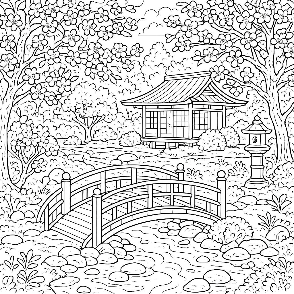 A detailed coloring page featuring Japanese tea garden with spring cherry blossoms. Perfect for tweens (9-12) with intricate detail for a fun coloring experience.