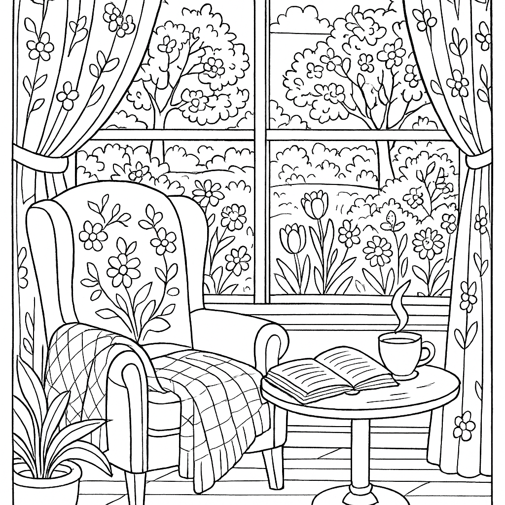 A detailed coloring page featuring a reading nook by a window overlooking a spring garden. Perfect for tweens (9-12) with intricate detail for a fun coloring experience.