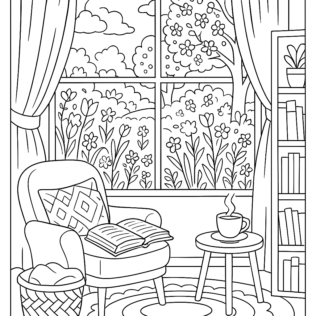 A detailed coloring page featuring a reading nook by a window with spring garden view. Perfect for tweens (9-12) with intricate detail for a fun coloring experience.