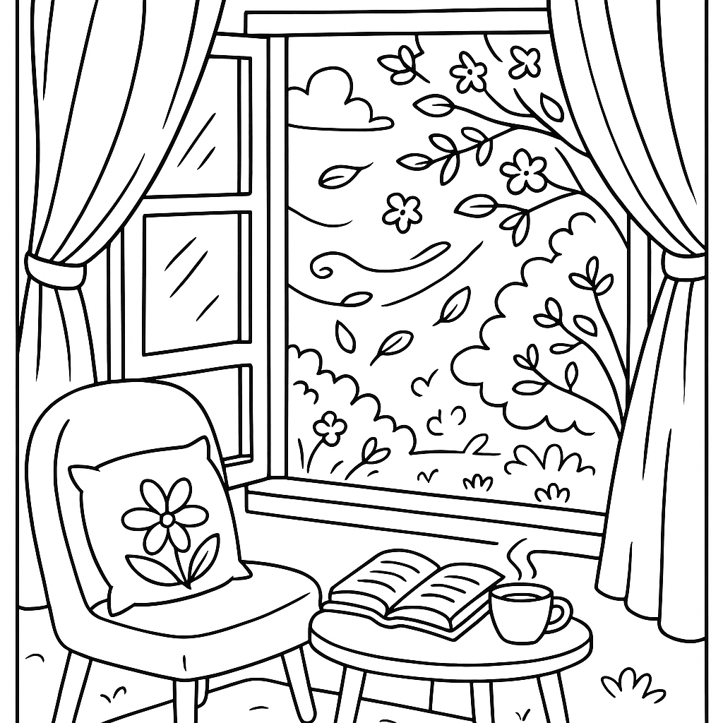 A medium coloring page featuring a reading nook by an open window with spring breeze. Perfect for kids (6-9) with moderately detailed outlines for a fun coloring experience.