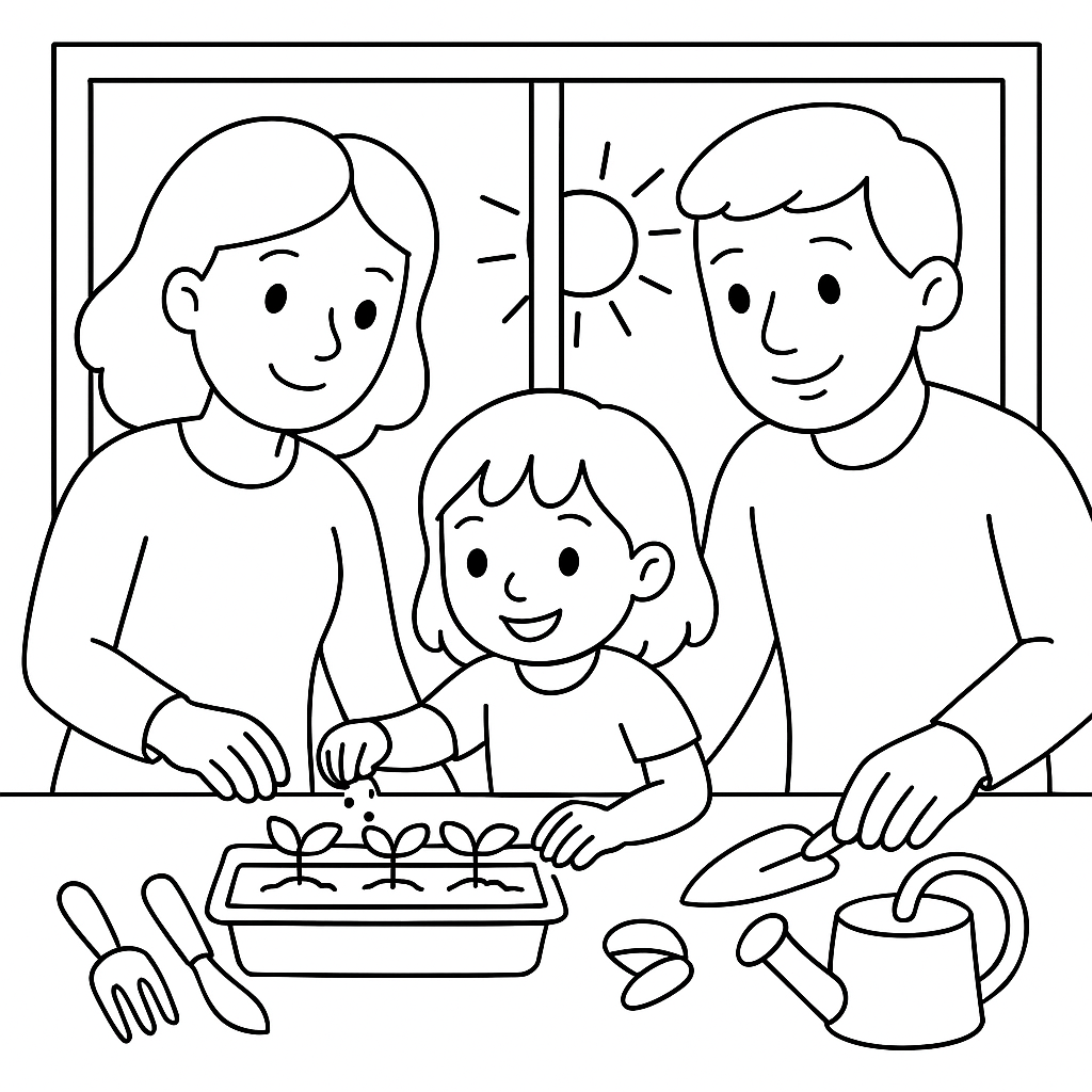 A simple coloring page featuring family starting seedlings on a sunny windowsill with garden tools. Perfect for kids (4-6) with large, bold outlines for a fun coloring experience.