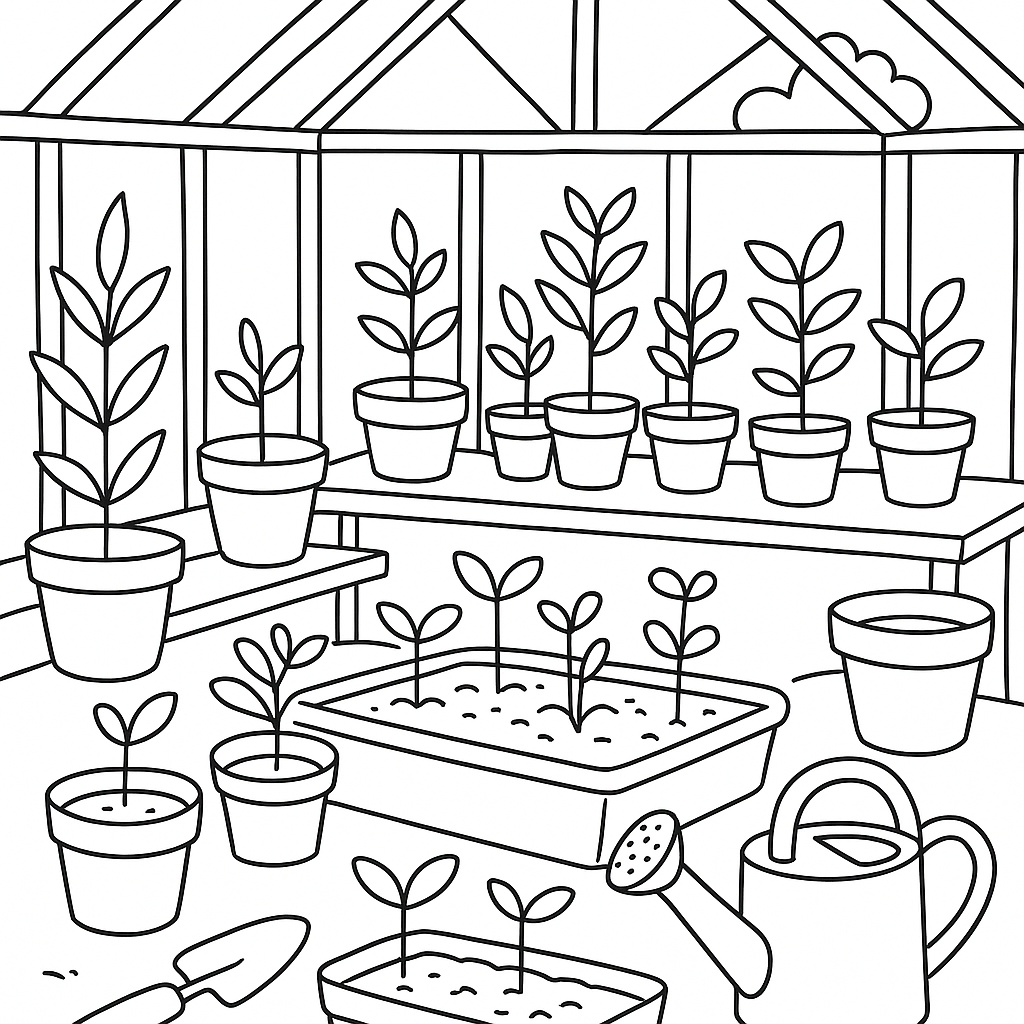 A medium coloring page featuring greenhouse filled with spring seedlings and gardening tools. Perfect for kids (6-9) with moderately detailed outlines for a fun coloring experience.
