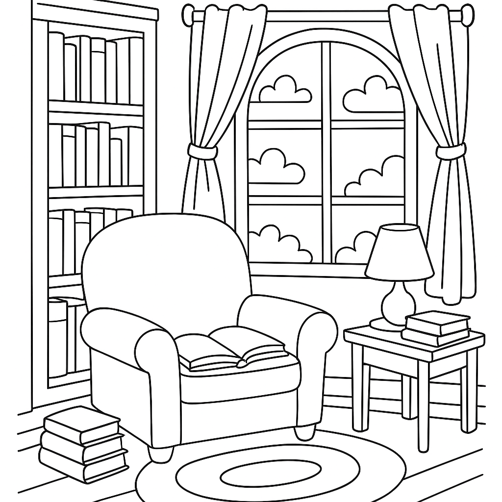 A medium coloring page featuring library reading nook with window and books. Perfect for kids (6-9) with moderately detailed outlines for a fun coloring experience.