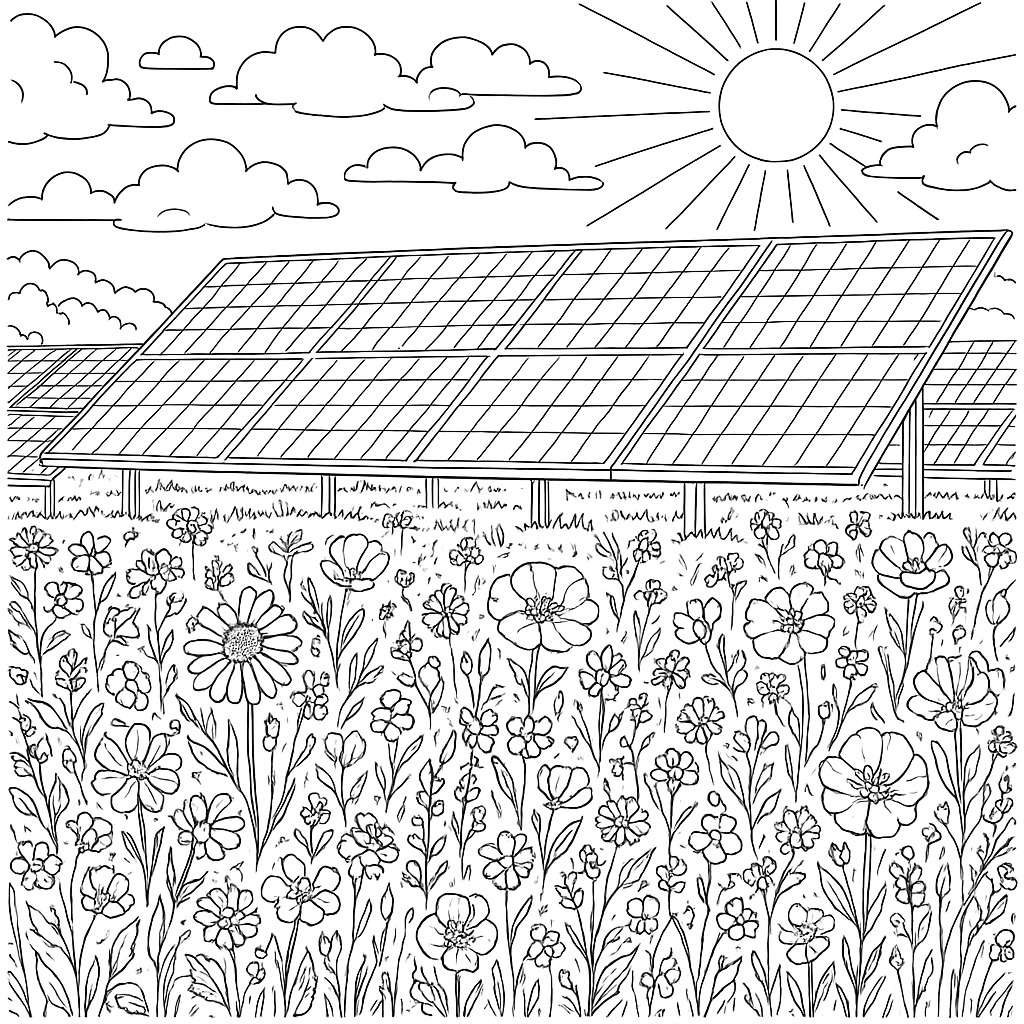 A detailed coloring page featuring solar panel field with spring wildflowers below. Perfect for tweens (9-12) with intricate detail for a fun coloring experience.