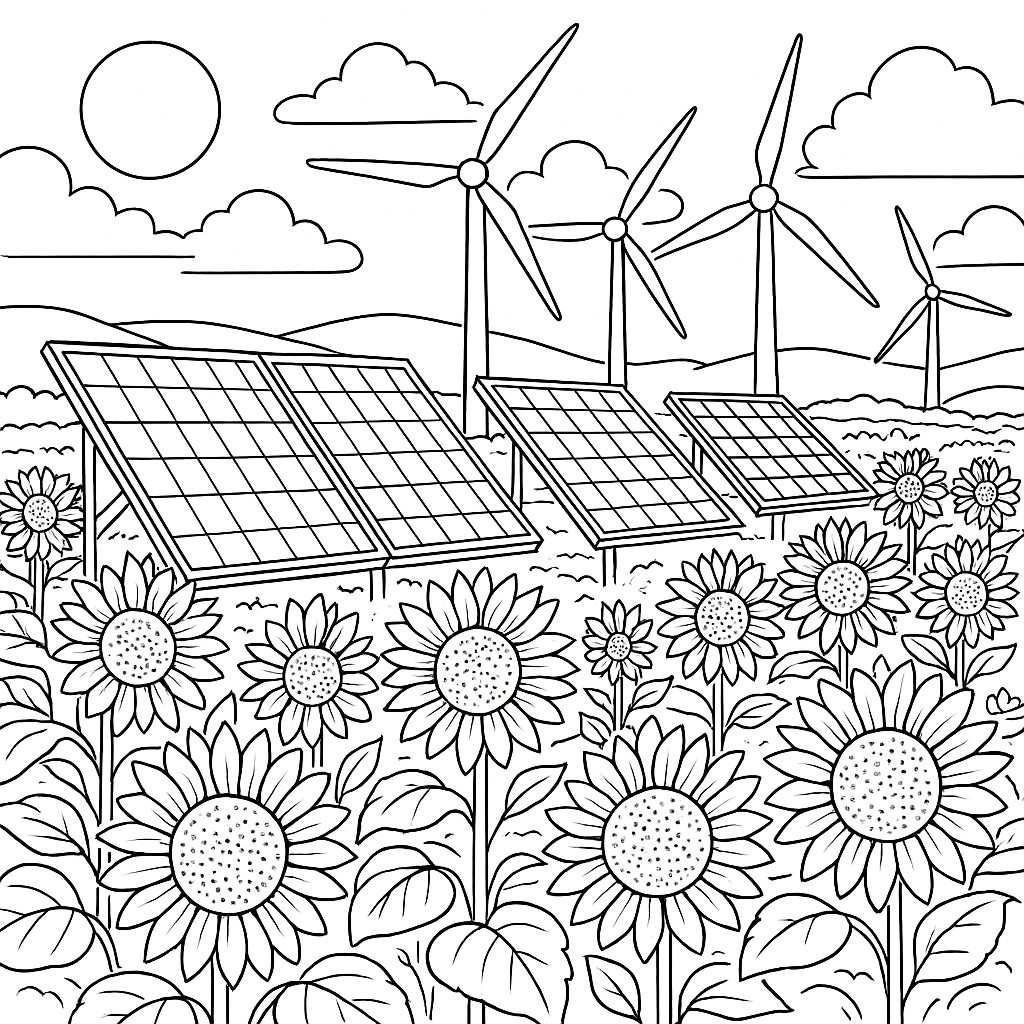 A detailed coloring page featuring solar panels and wind turbines in a field of blooming sunflowers. Perfect for tweens (9-12) with intricate detail for a fun coloring experience.