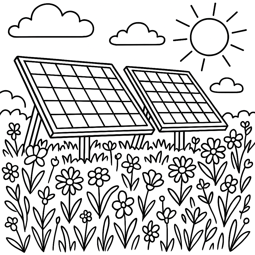A medium coloring page featuring solar panels in a field of spring wildflowers. Perfect for kids (6-9) with moderately detailed outlines for a fun coloring experience.