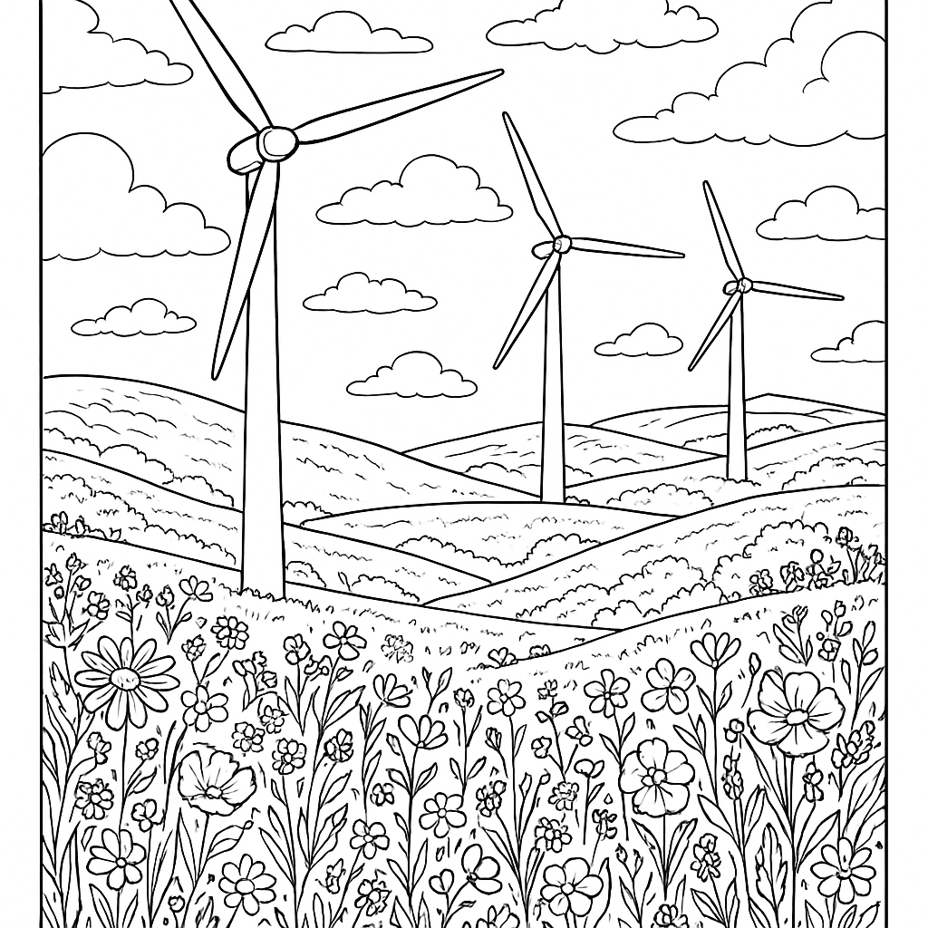 A detailed coloring page featuring wind farm on green hills with wildflower meadows. Perfect for tweens (9-12) with intricate detail for a fun coloring experience.