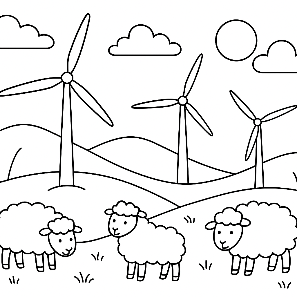 A medium coloring page featuring wind farm on rolling hills with sheep grazing below turbines. Perfect for kids (6-9) with moderately detailed outlines for a fun coloring experience.