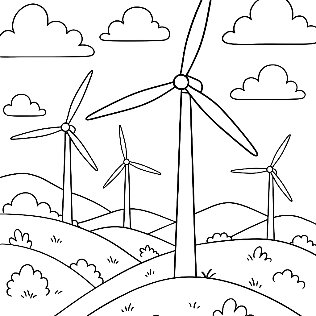 A medium coloring page featuring wind farm with turbines on hillside. Perfect for kids (6-9) with moderately detailed outlines for a fun coloring experience.