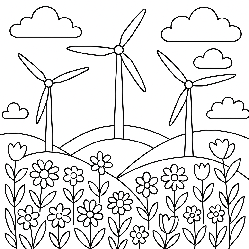 A medium coloring page featuring wind turbines on rolling hills with spring flowers. Perfect for kids (6-9) with moderately detailed outlines for a fun coloring experience.