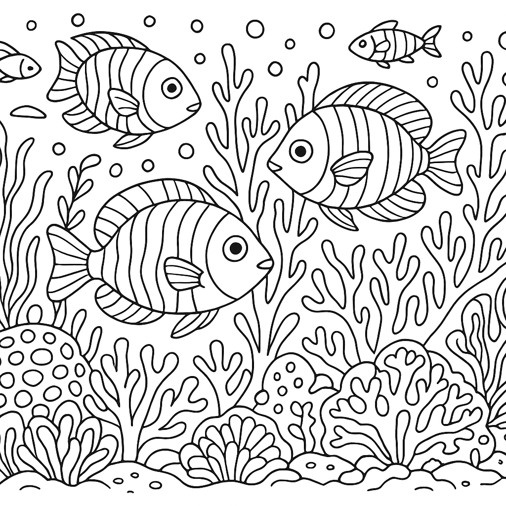 A detailed coloring page featuring coral reef ecosystem with colorful fish. Perfect for kids (6-9) with intricate detail for a fun coloring experience.