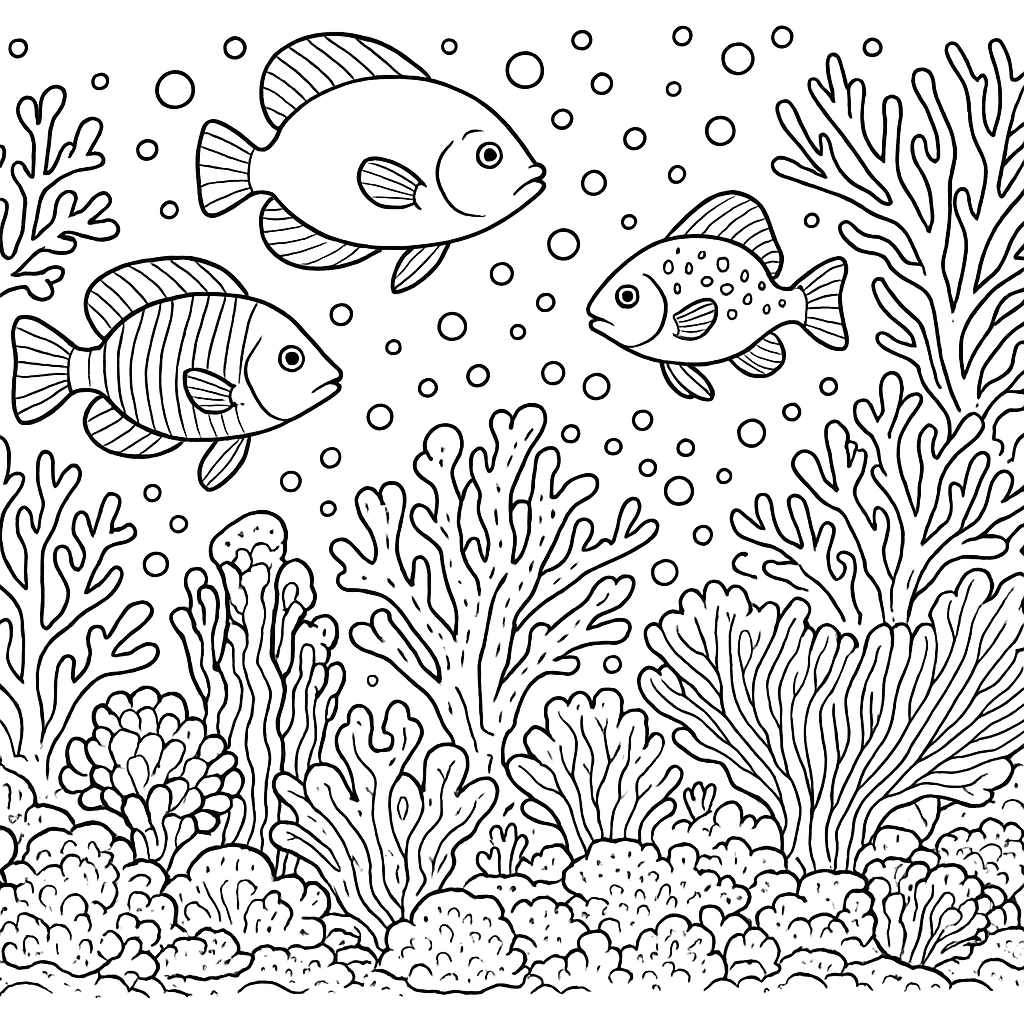 A detailed coloring page featuring coral reef spawning with colorful fish and new coral growth. Perfect for tweens (9-12) with intricate detail for a fun coloring experience.