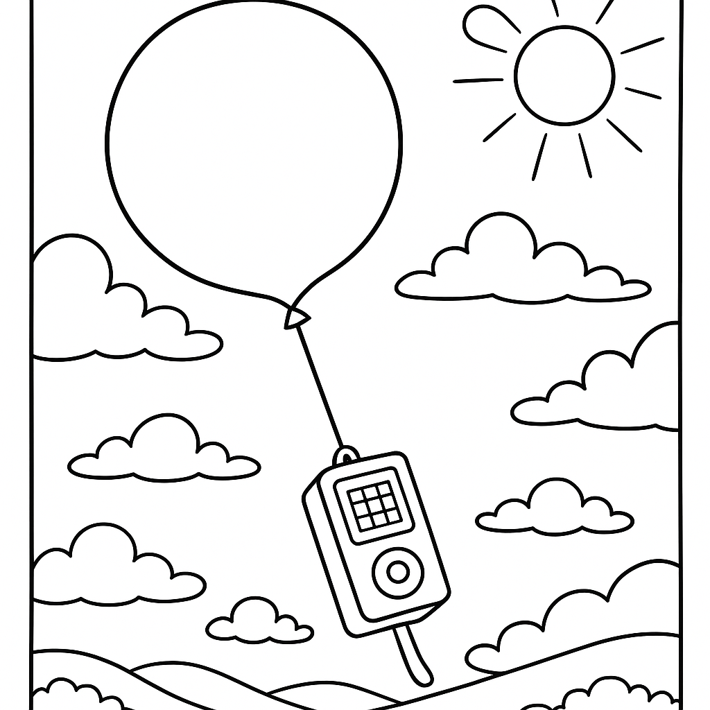 A medium coloring page featuring weather balloon collecting atmospheric data. Perfect for kids (6-9) with moderately detailed outlines for a fun coloring experience.