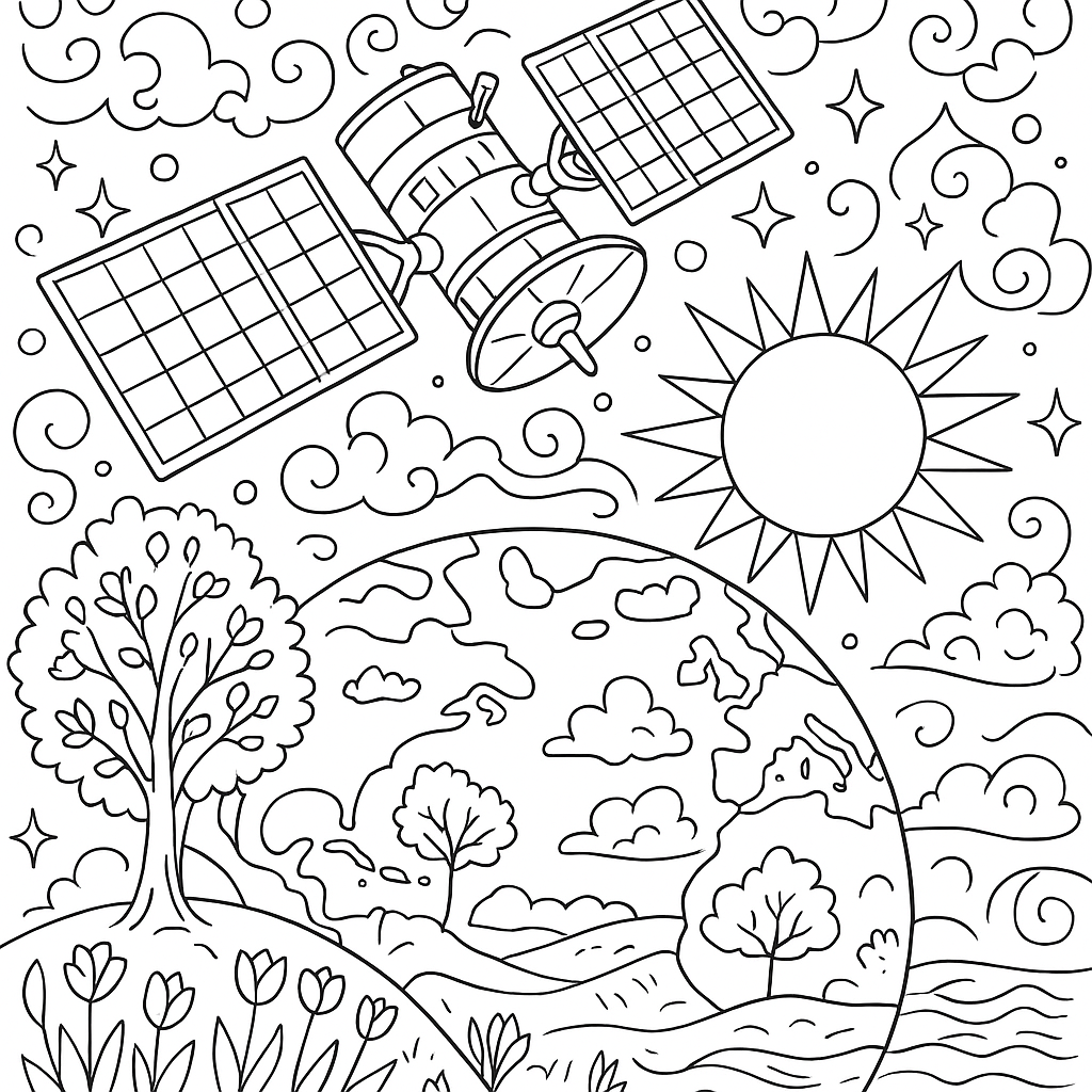 A detailed coloring page featuring weather satellite monitoring Earth's spring changes. Perfect for tweens (9-12) with intricate detail for a fun coloring experience.