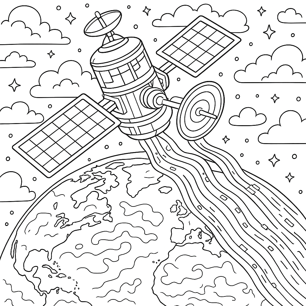 A detailed coloring page featuring weather satellite orbiting earth with data streams. Perfect for tweens (9-12) with intricate detail for a fun coloring experience.