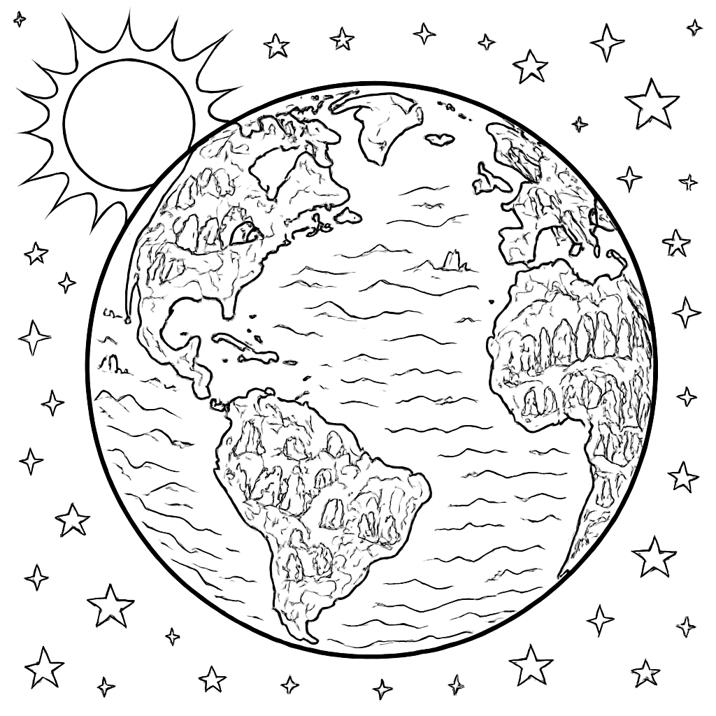 A detailed coloring page featuring Earth from space showing spring blooming across continents. Perfect for tweens (9-12) with intricate detail for a fun coloring experience.