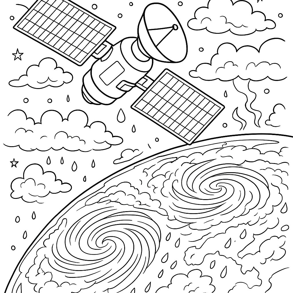 A detailed coloring page featuring satellite monitoring spring storm systems. Perfect for tweens (9-12) with intricate detail for a fun coloring experience.