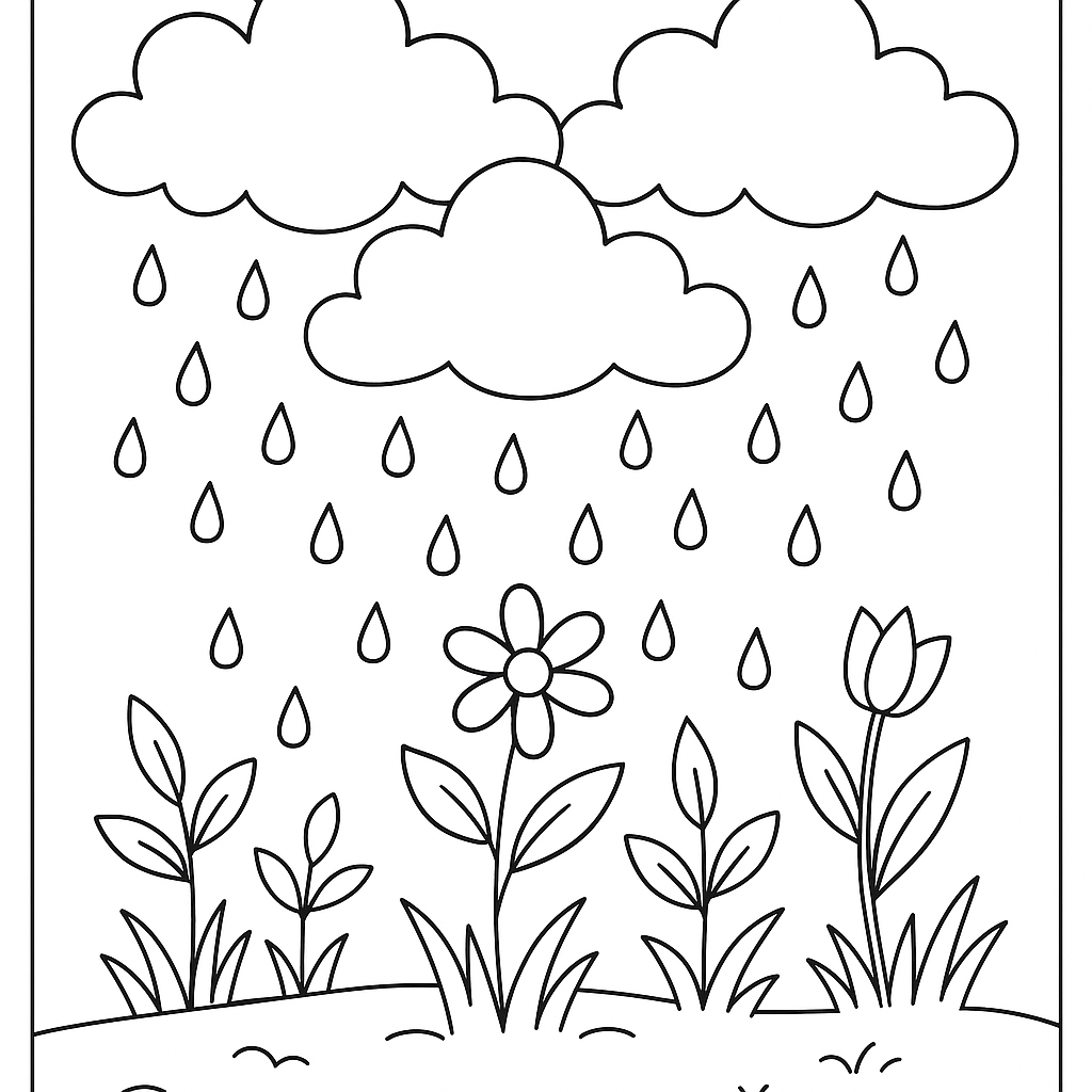 A medium coloring page featuring spring rain cycle showing clouds, rain, and growing plants. Perfect for kids (6-9) with moderately detailed outlines for a fun coloring experience.