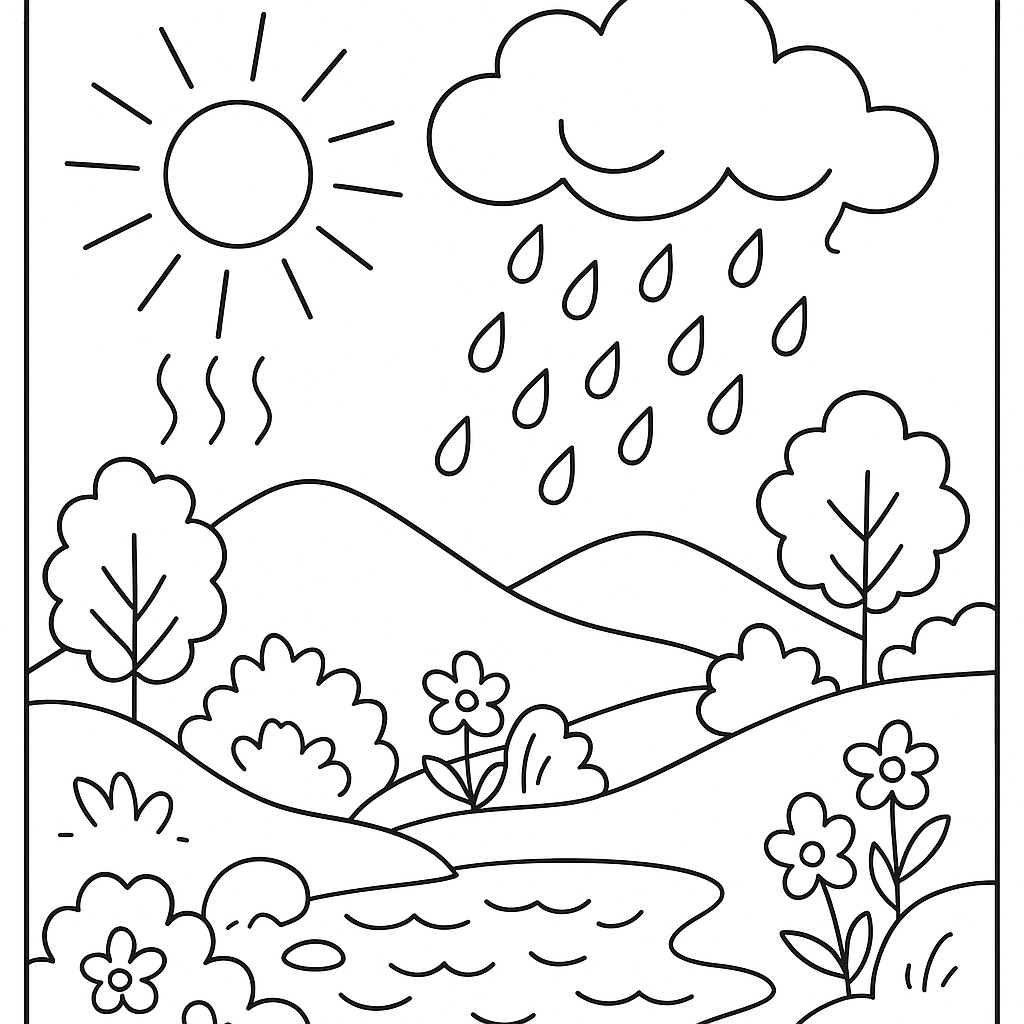 A medium coloring page featuring the water cycle showing spring rain, evaporation and cloud formation. Perfect for kids (6-9) with moderately detailed outlines for a fun coloring experience.