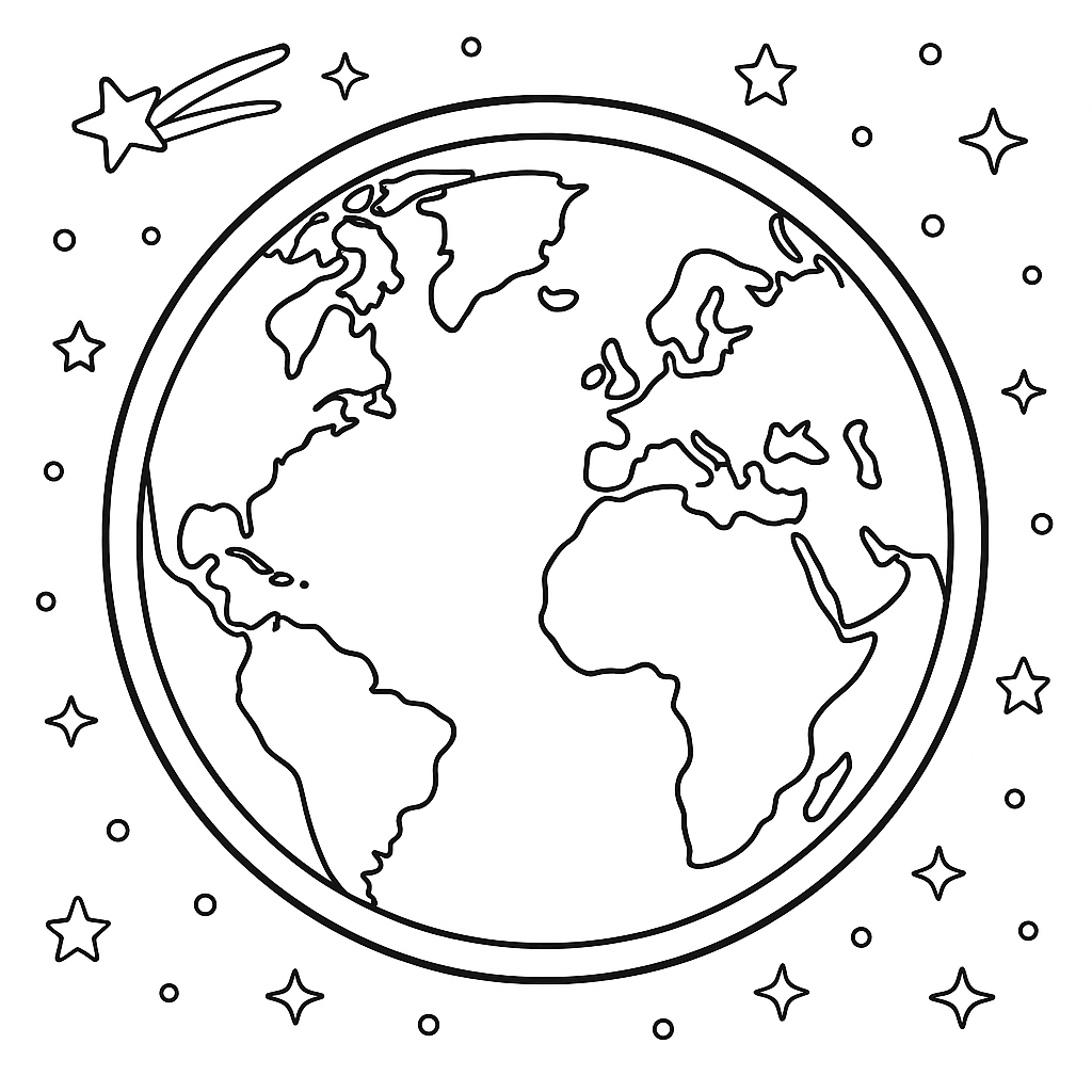 A medium coloring page featuring Earth from space showing spring green continents. Perfect for kids (6-9) with moderately detailed outlines for a fun coloring experience.