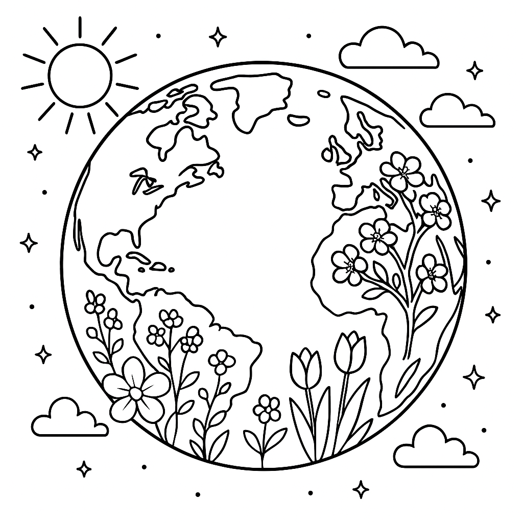 A medium coloring page featuring Earth from space showing the spring hemisphere in bloom. Perfect for kids (6-9) with moderately detailed outlines for a fun coloring experience.