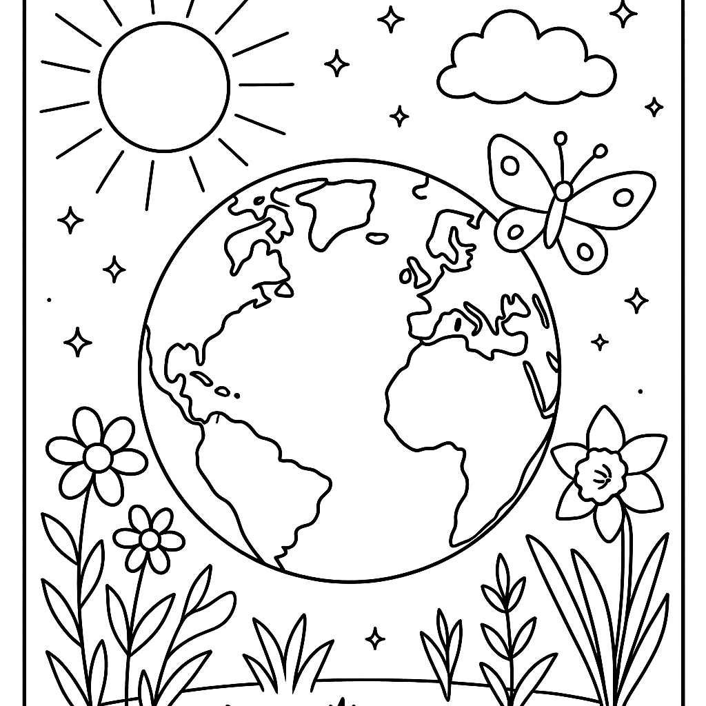 A medium coloring page featuring Earth viewed from space showing spring awakening. Perfect for kids (6-9) with moderately detailed outlines for a fun coloring experience.