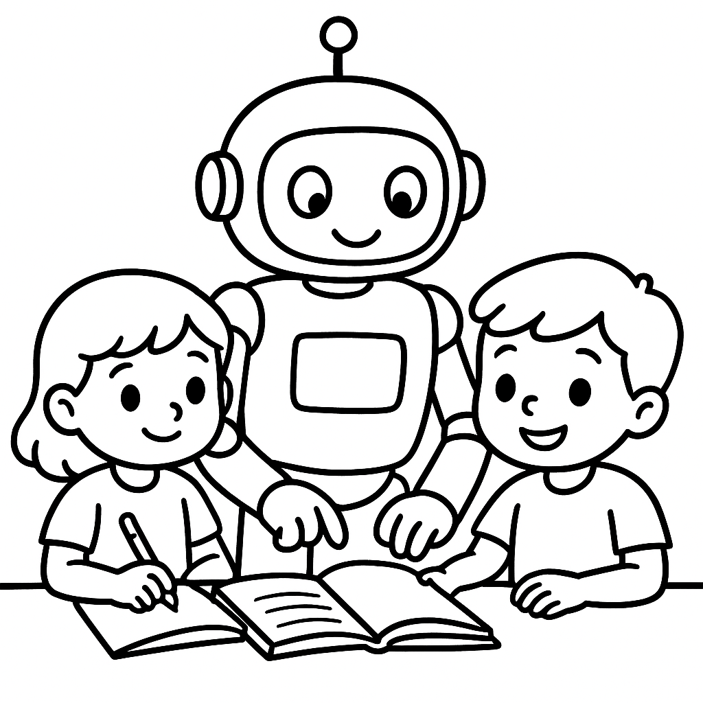 A simple coloring page featuring friendly robot helping children with homework. Perfect for kids (4-6) with large, bold outlines for a fun coloring experience.