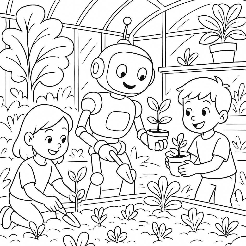 A medium coloring page featuring helpful robot gardening with children in futuristic greenhouse. Perfect for kids (6-9) with moderately detailed outlines for a fun coloring experience.