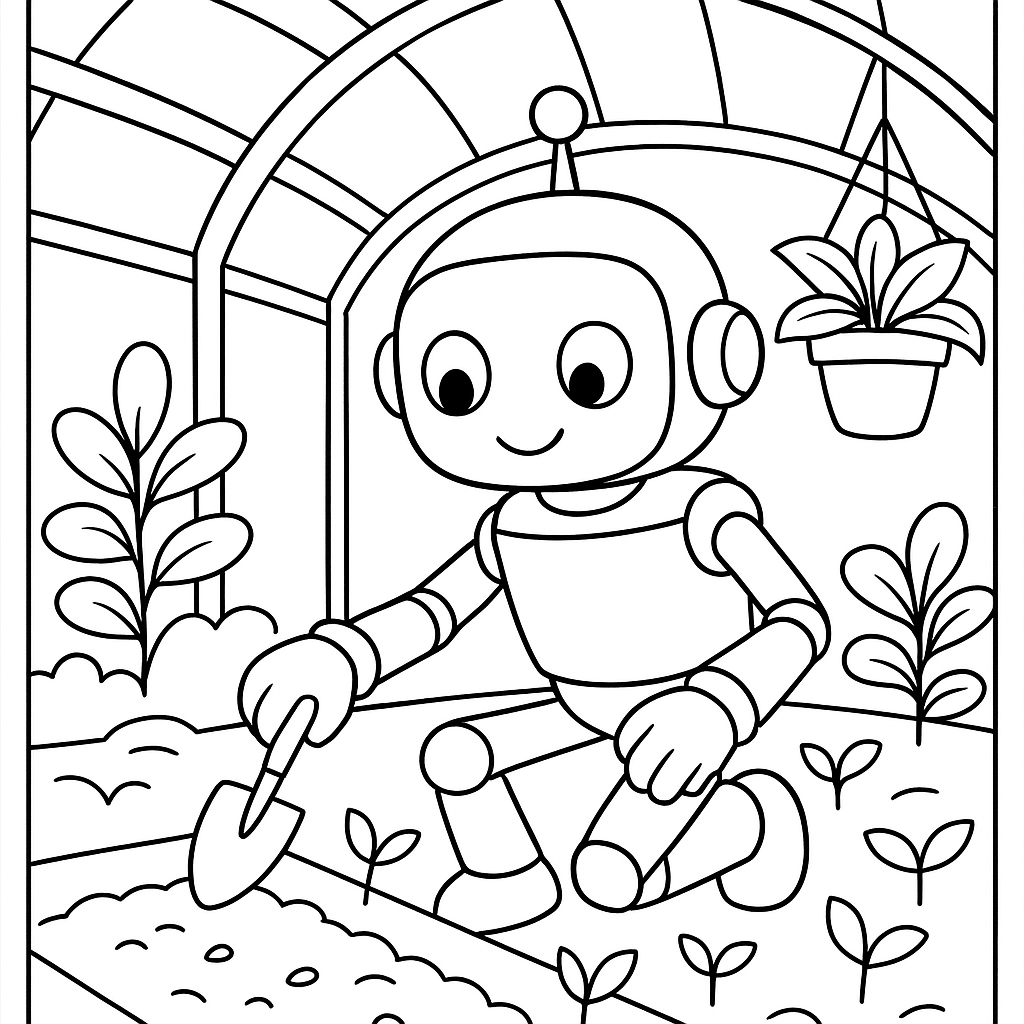 A medium coloring page featuring robot gardener planting seeds in greenhouse. Perfect for kids (6-9) with moderately detailed outlines for a fun coloring experience.