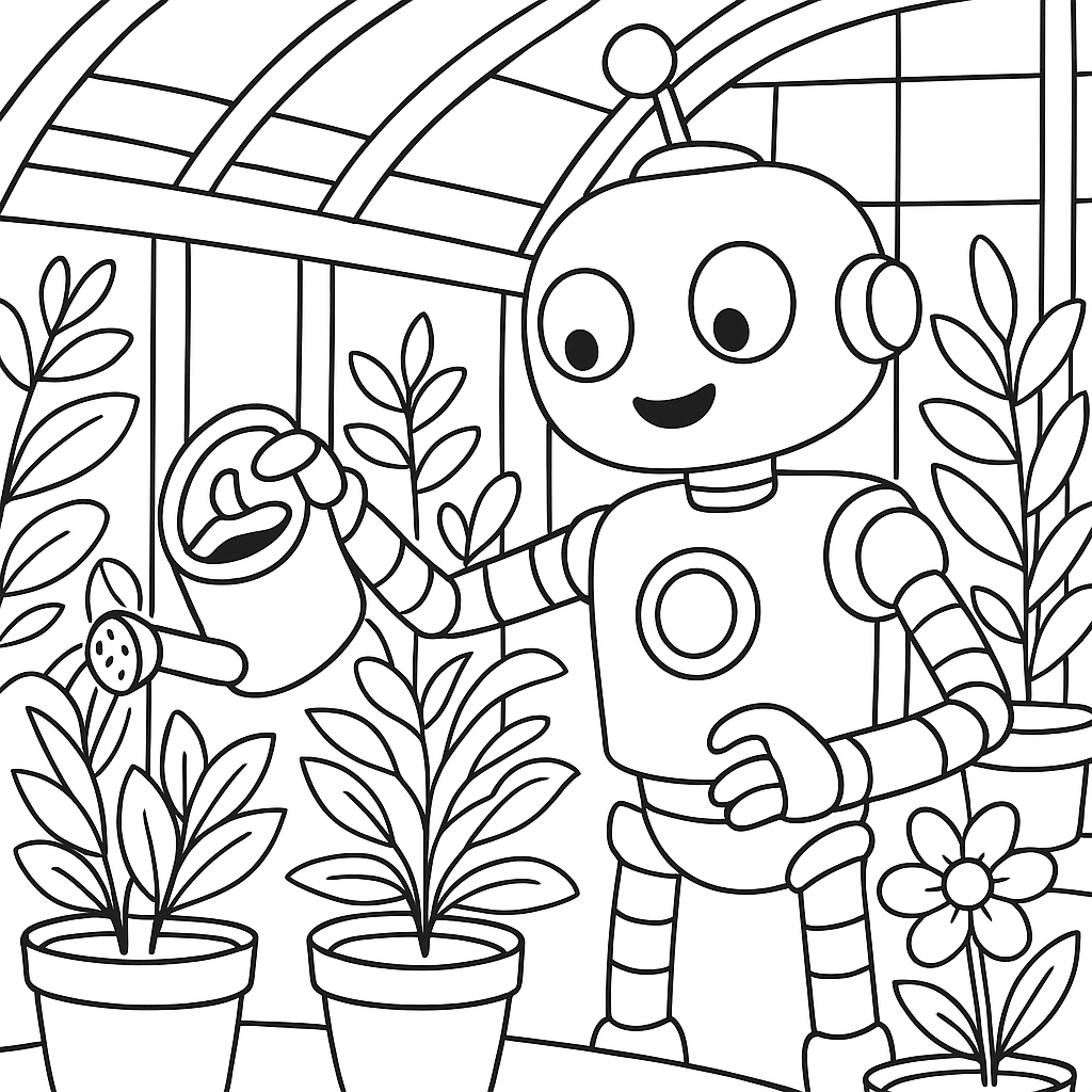 A medium coloring page featuring robot helping with greenhouse plant care. Perfect for kids (6-9) with moderately detailed outlines for a fun coloring experience.