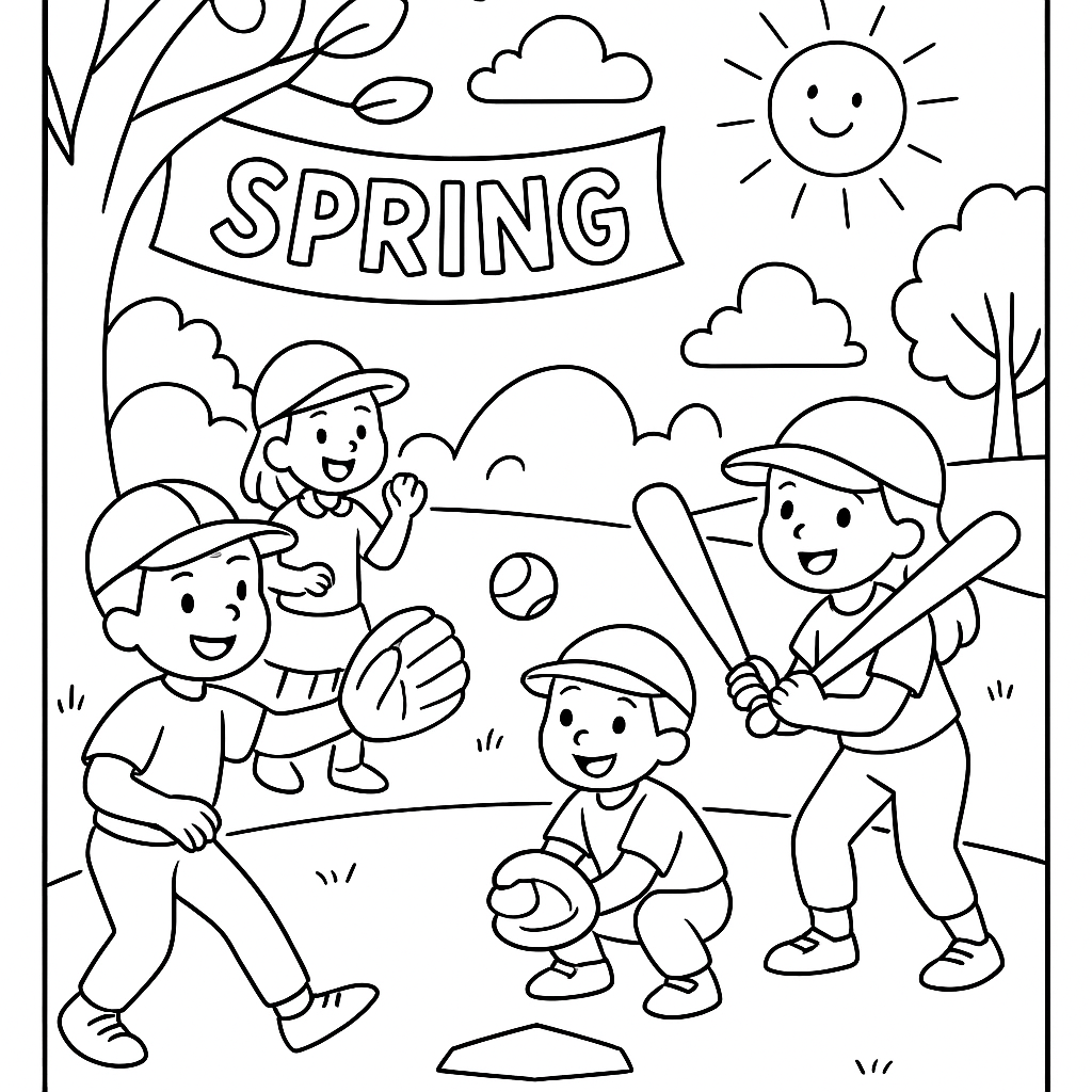 A medium coloring page featuring children playing baseball on opening day of spring season. Perfect for kids (6-9) with moderately detailed outlines for a fun coloring experience.