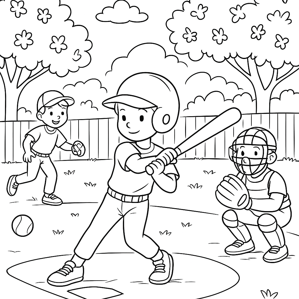 A medium coloring page featuring kids playing baseball in a spring league. Perfect for kids (6-9) with moderately detailed outlines for a fun coloring experience.