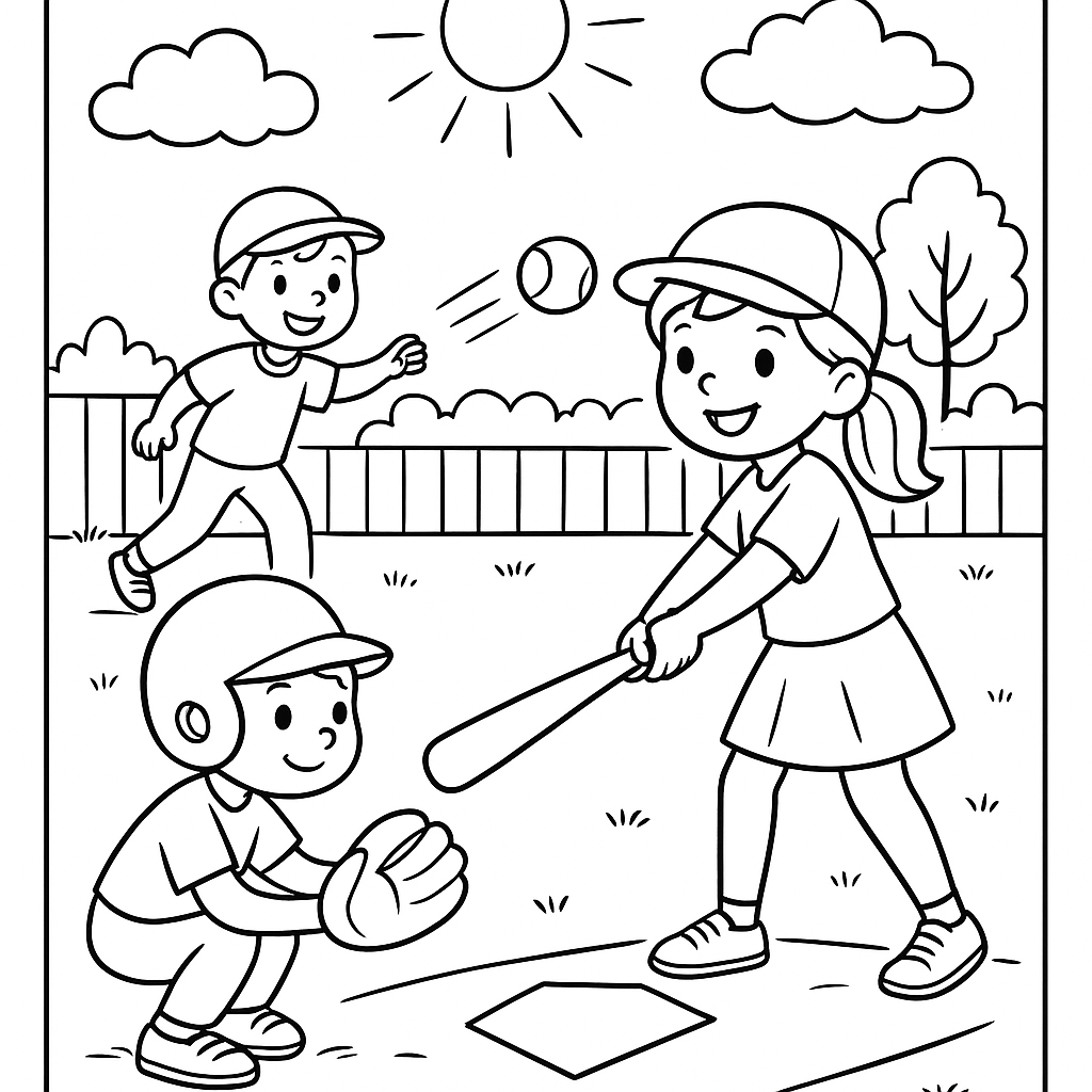 A medium coloring page featuring kids playing baseball on a sunny spring day at home plate. Perfect for kids (6-9) with moderately detailed outlines for a fun coloring experience.