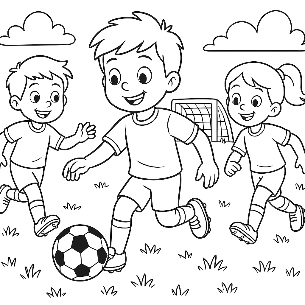 A medium coloring page featuring soccer game on fresh spring grass field. Perfect for kids (6-9) with moderately detailed outlines for a fun coloring experience.