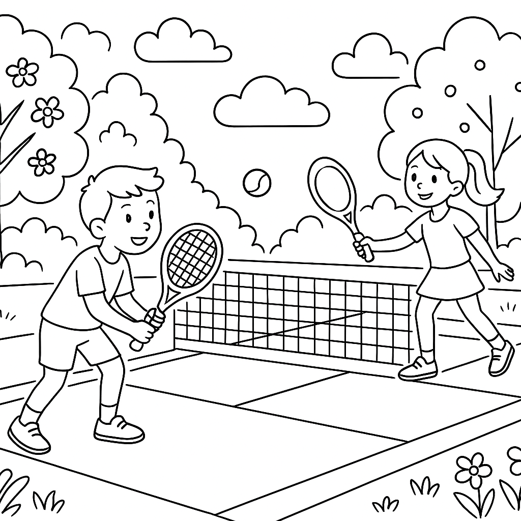A medium coloring page featuring tennis match on outdoor spring court. Perfect for kids (6-9) with moderately detailed outlines for a fun coloring experience.