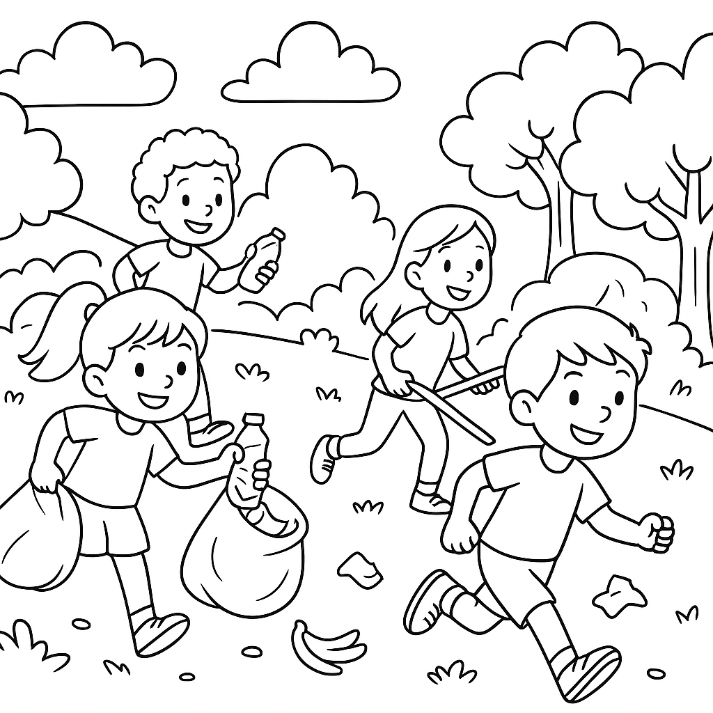 A medium coloring page featuring children participating in a nature cleanup race. Perfect for kids (6-9) with moderately detailed outlines for a fun coloring experience.
