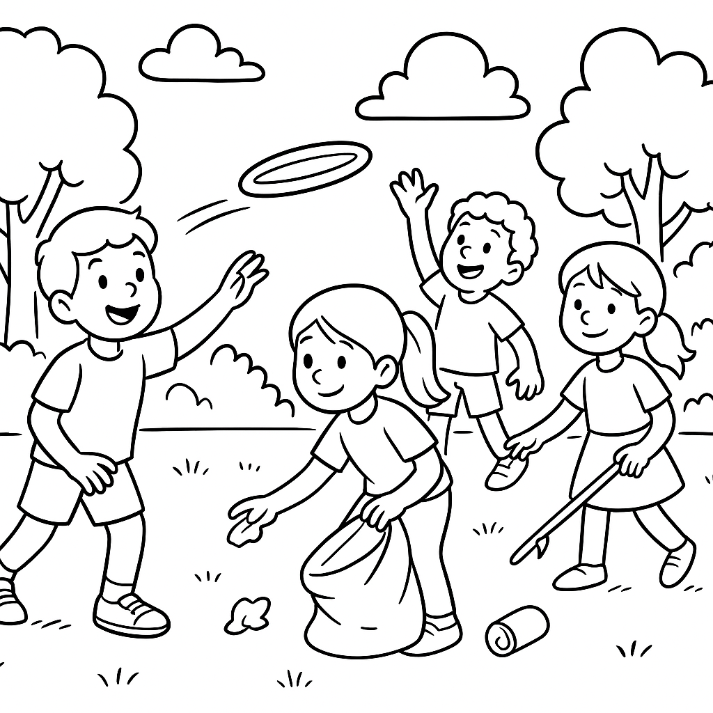 A medium coloring page featuring children playing frisbee in a park cleanup setting. Perfect for kids (6-9) with moderately detailed outlines for a fun coloring experience.