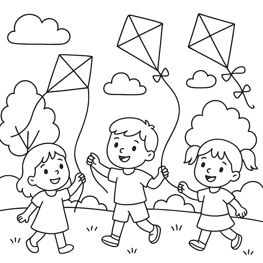 A simple coloring page featuring children flying colorful kites in a park. Perfect for kids (4-6) with large, bold outlines for a fun coloring experience.