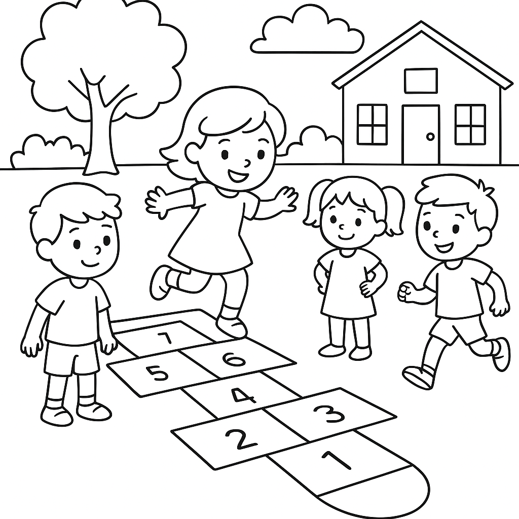 A simple coloring page featuring children playing hopscotch in school playground. Perfect for kids (4-6) with large, bold outlines for a fun coloring experience.
