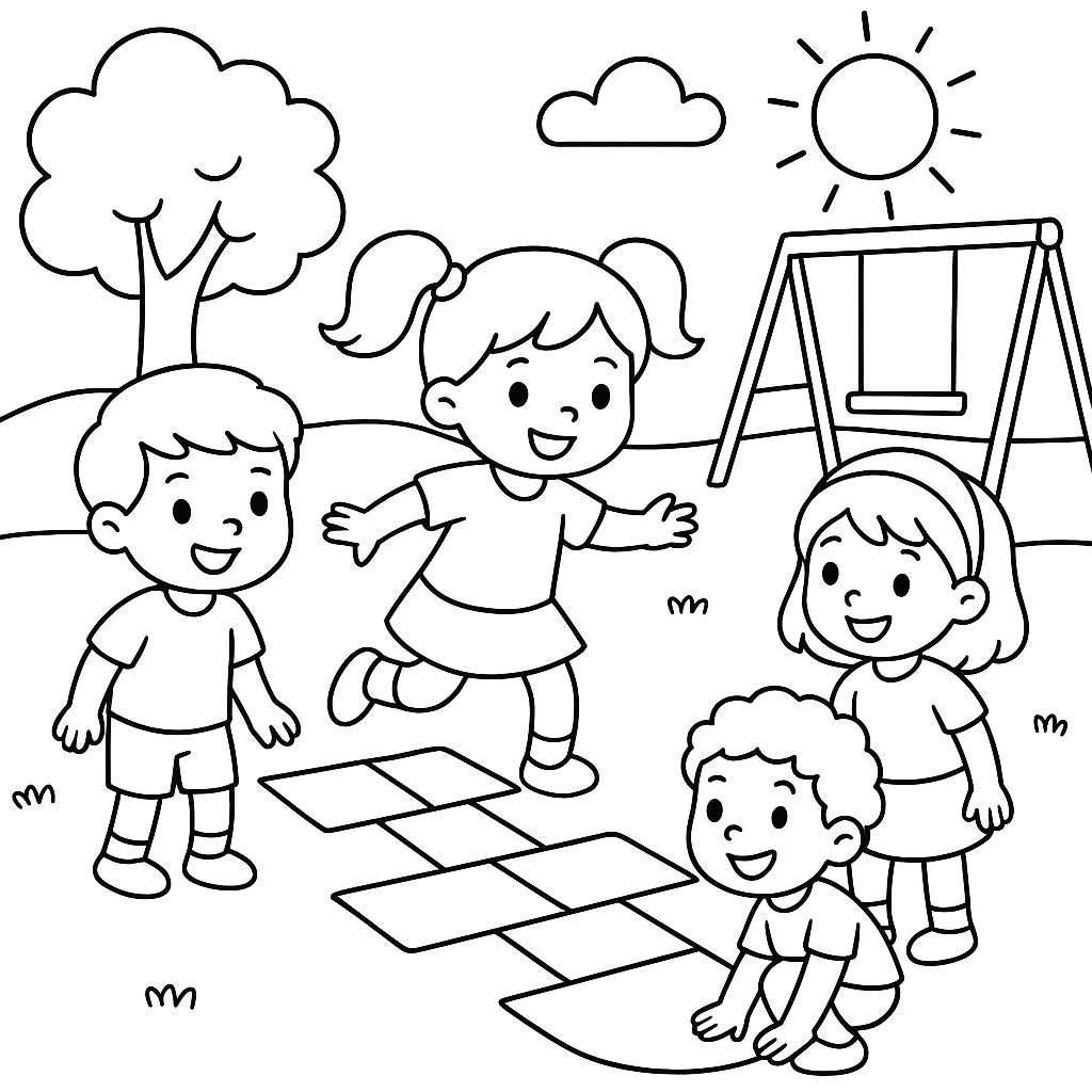 A simple coloring page featuring children playing hopscotch on spring playground. Perfect for kids (4-6) with large, bold outlines for a fun coloring experience.